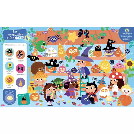 À travers 9 planches foisonnantes de détails, les petits partent à l’exploration d'endroits hantés et drôlement effrayants ! Ils observent attentivement et retrouvent 7 éléments (+ la mascotte) bien cachés sur chaque planche : de gentils fantômes, des drôles de vampires, des citrouilles vivantes ou encore des sorcières malicieuses... Du vernis phosphorescent permet de retrouver des éléments cachés dans le noir !