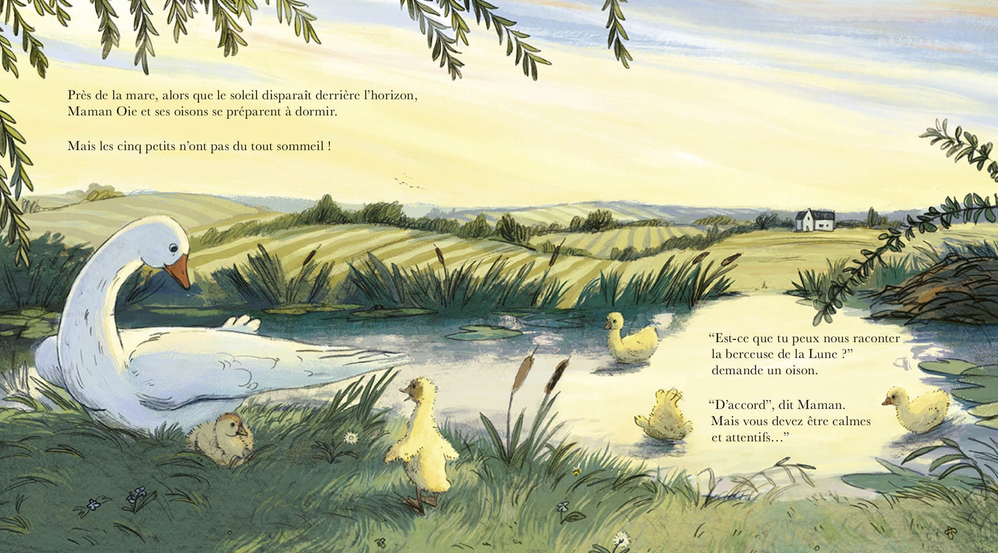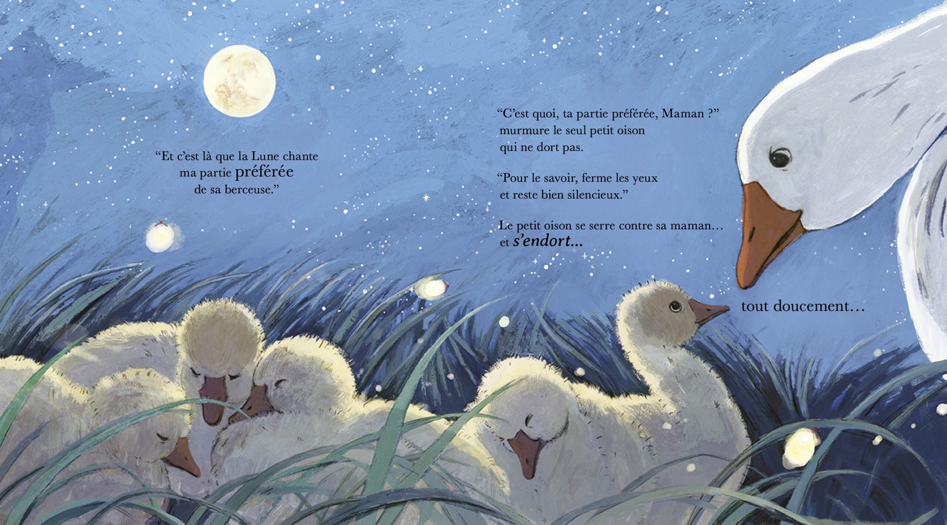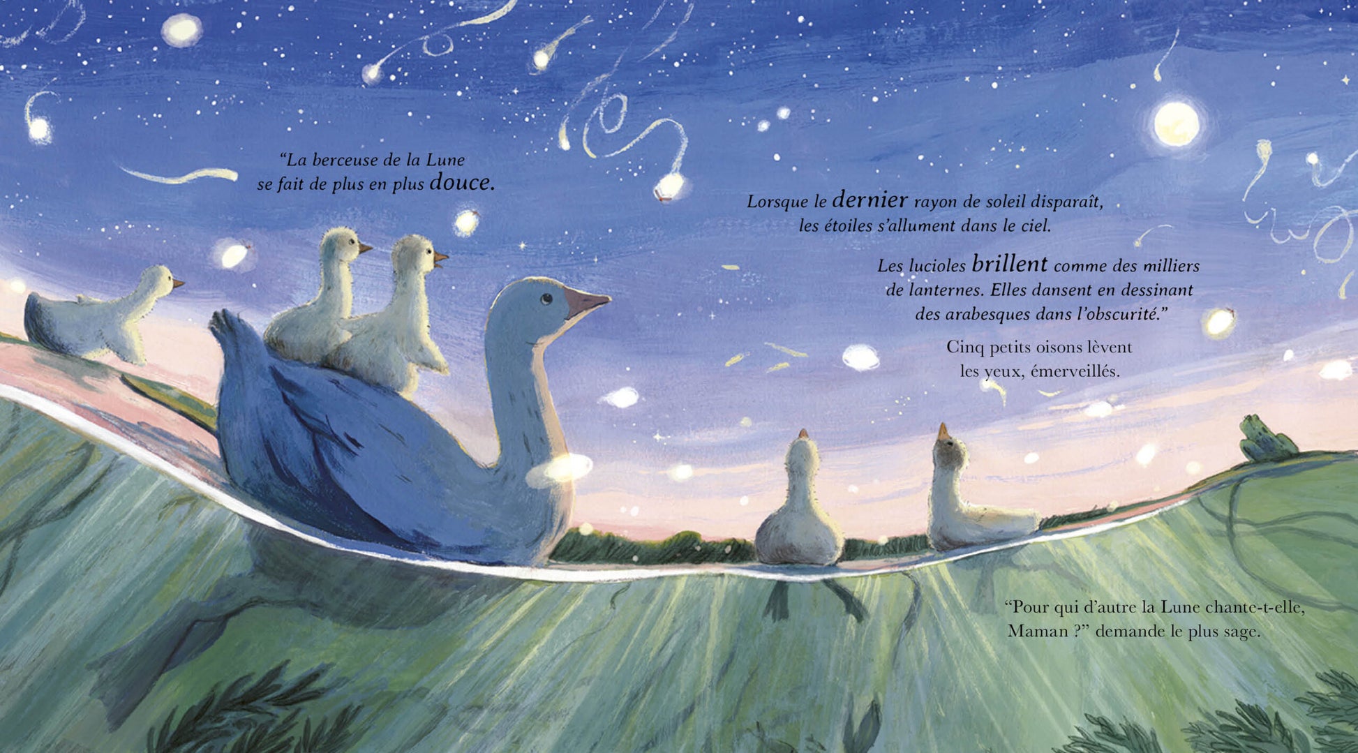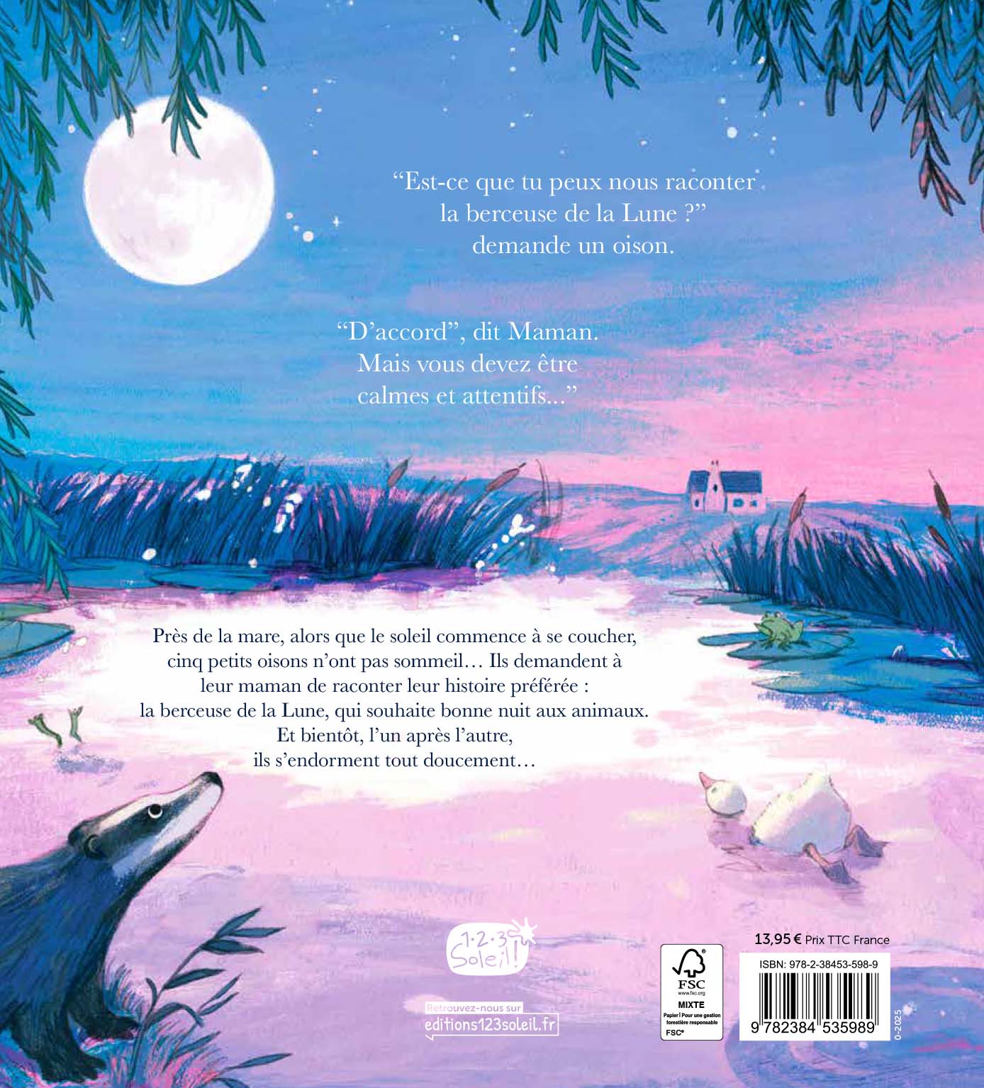 Près de la mare. quand le soleil commence à décliner. Maman Oie et ses oisons se préparent à dormir. Mais les cinq petits n’ont pas du tout sommeil. “Est-ce que tu peux nous raconter la berceuse de la Lune ?” demande l’un des oisons. “D’accord”. dit Maman. Mais vous devez être calmes et attentifs…” Dans ce bel album rempli d’émotion. maman Oie incarne la tendresse et la patience. et les illustrations de Júlia Moscardó. dans une palette nocturne feutrée. accompagnent le texte avec délicatesse. Une histoire toute en douceur pour s’endormir paisiblement. le cœur bercé par les mots d’un parent.