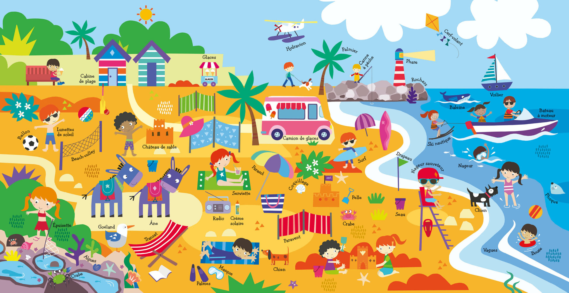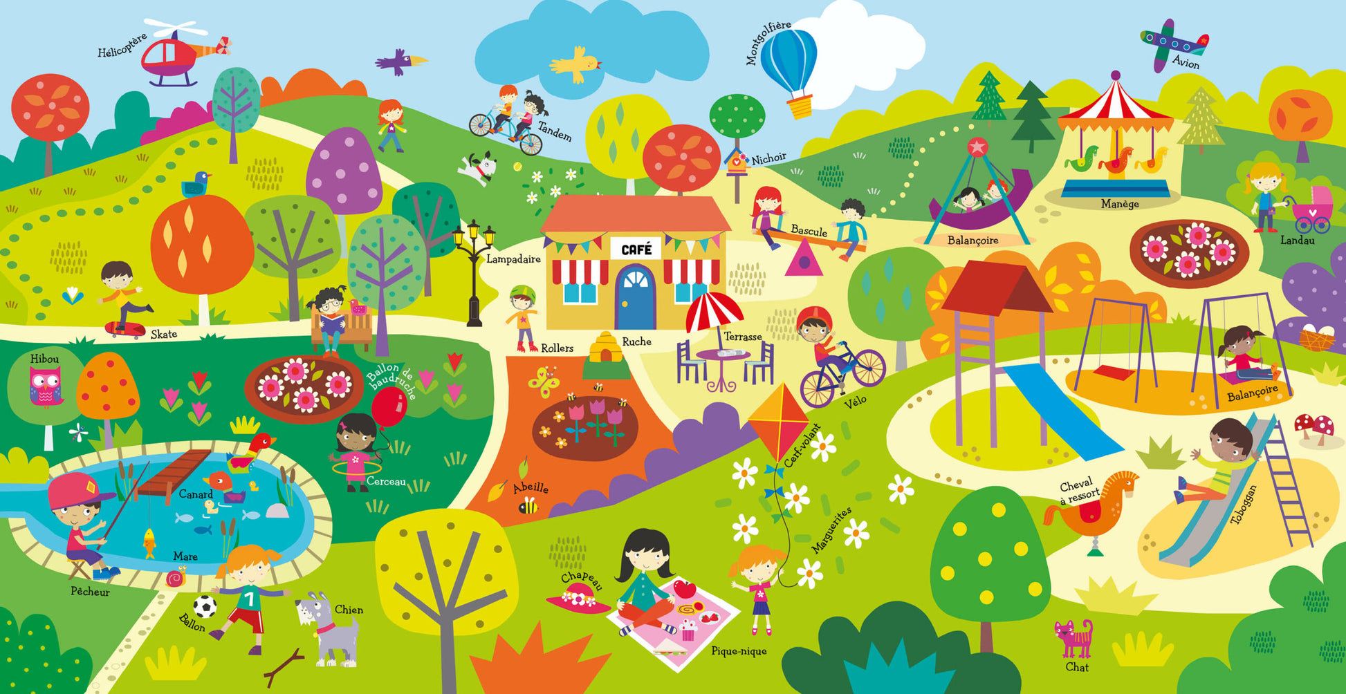 Ce livre sonore grand format propose de découvrir 5 lieux : la ville, la plage, la montagne, le parc, la ferme, avec 50 sons associés. Les illustrations à chercher sont de grande taille pour favoriser l’attention. Un livre joyeux et coloré pour exercer la mémoire visuelle et auditive des jeunes enfants.