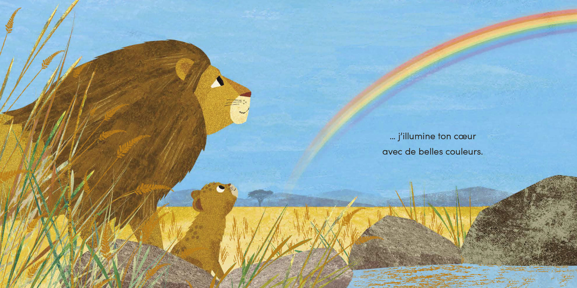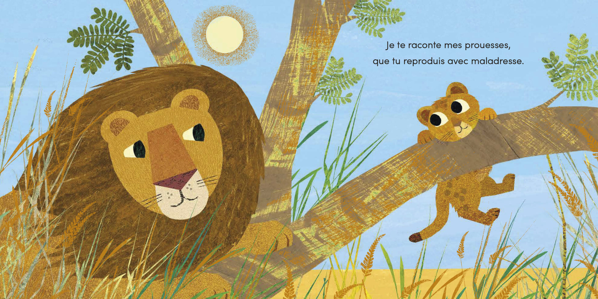 Cet album est une superbe lettre d’amour d’un grand-père Lion à son petit lionceau. Grimper aux arbres, jouer, explorer la savane, se raconter des histoires… Les moments partagés, pleins de tendresse et de complicité, resteront à jamais gravés dans leurs cœurs. Une belle histoire sur la relation petits-enfants/grands-parents, magnifiée par des effets de dorure sur la couverture et sur toutes les pages intérieures;