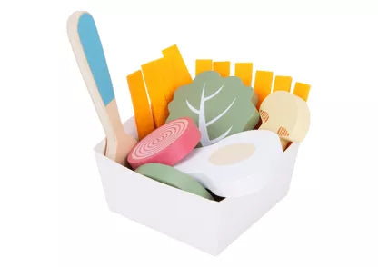 • 25 aliments et accessoires en bois : fruits, tartines, œufs, couverts et même une adorable petite souris !
